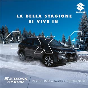 *Prezzo promo chiavi in mano riferito a S-Cross Hybrid 1.4 TOP Bianco Santorini - IPT, PFU ed eventuali spese di rottamazione esclusi - presso i concessionari aderenti . La valutazione di eventuali vetture in permuta sarà effettuata in sede di sottoscrizione del contratto. Prezzo promo chiavi in mano calcolato con: incentivo Suzuki con permuta/rottamazione di € 5500,00 L’offerta è applicabile per tutti i contratti stipulati dal 01/04/2026 al 31/04/2026